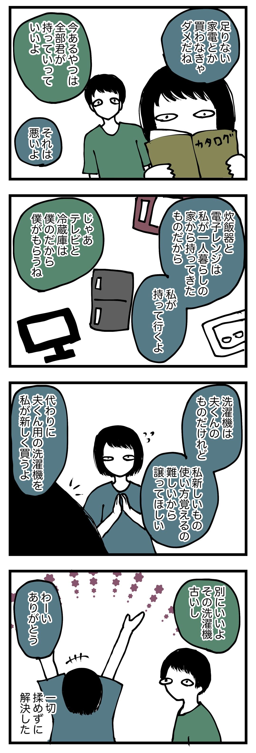 【別居】別居にあたっての家電争奪戦 2022年08月04日 歳の差16歳、社会不適合同士の子なし夫婦です。初めての方はこちらから歳の差の話はこちらから選択子なしの話はこちらから別居の話はこちらから私たち夫婦は別居しています。別居シリーズ前回の話 別居することが決まった我が家。今まで共同で使っていたもの(主に家電や家具)は分配して足りないものは買わなくてはならない。争奪戦 ファイッ平和。これから別居しようとしているのに、揉め事や不穏な空気は一切なく、話は進んでいく。次の話 ------------------------------------------------------------- にほんブログ村 ご連絡はmochizukiyt@gmail.comへ 「(旧)別居」カテゴリの最新記事 タグ :#別居#歳の差 < 前の記事次の記事 >
