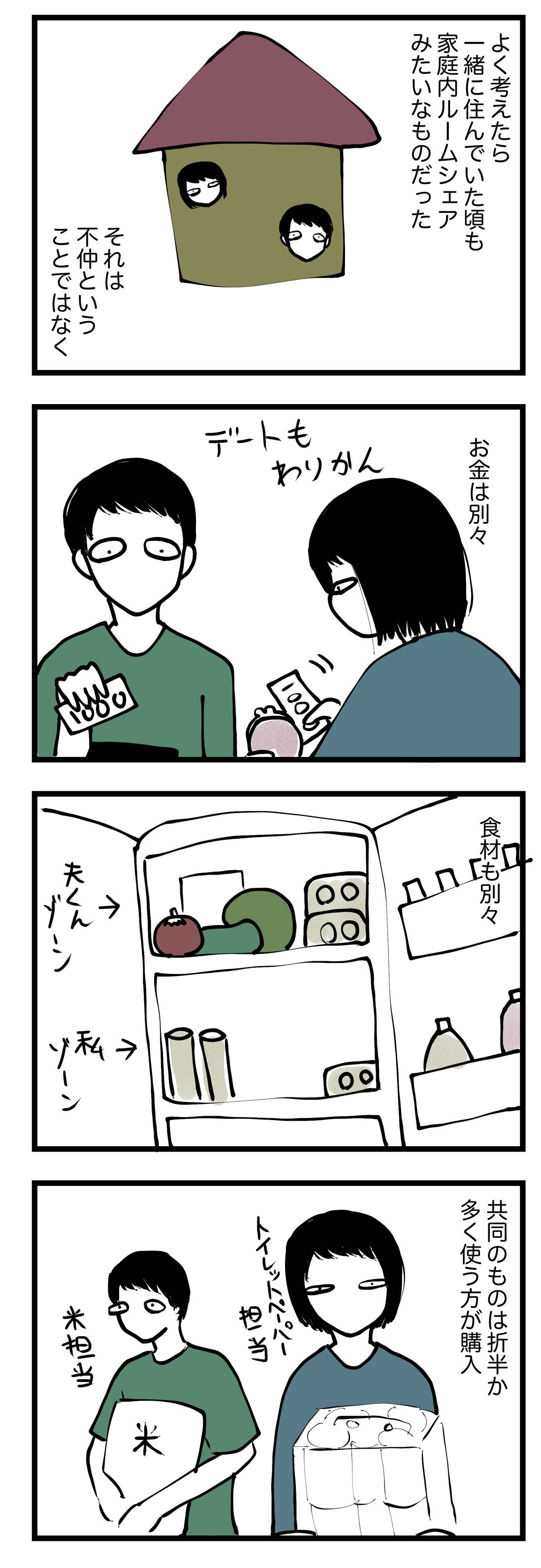 【家庭内ルームシェア】結婚生活?(前編) 2022年08月22日 歳の差16歳、社会不適合同士の子なし夫婦です。初めての方はこちらから歳の差の話はこちらから選択子なしの話はこちらから別居の話はこちらから私たち夫婦は現在別居中ですが、同居していた頃も、結婚生活というよりはルームシェアみたいな感じでした。だいたいのものが別々。共同のお財布はありません。卵も、夫くんは夫くん用の卵を買い、私は私用の卵を買っていました。だから家には常に卵が2パックある。続きます。 にほんブログ村 ご連絡はmochizukiyt@gmail.comへ 「家庭内ルームシェア」カテゴリの最新記事 タグ :#歳の差#ルームシェア < 前の記事次の記事 >