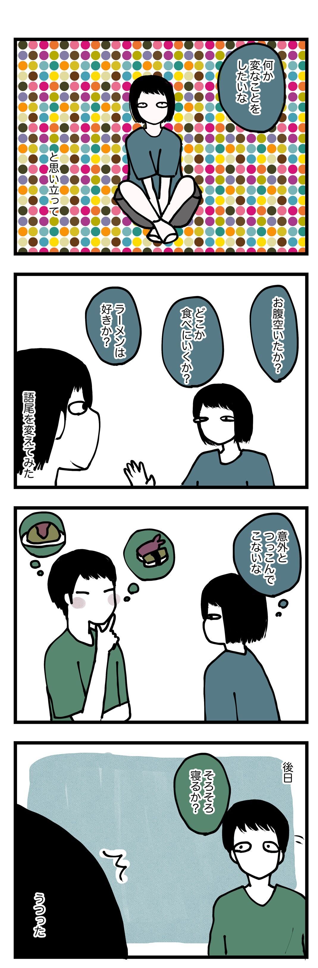 夫は妻の変化に気づくのかチャレンジ 2022年09月02日 歳の差16歳、社会不適合同士の子なし夫婦です。初めての方はこちらから歳の差の話はこちらから選択子なしの話はこちらから別居の話はこちらから前回の話 果たして夫くんは、私が語尾を変えたことと、自分にもうつっていることに、気がついているのだろうか。もちろん「〜か?」って語尾は夫くんの前でしか使わないです。だって変じゃん。こちらもどうぞ にほんブログ村 ご連絡はmochizukiyt@gmail.comへ 「夫婦の日常」カテゴリの最新記事 タグ :#夫婦 < 前の記事次の記事 >