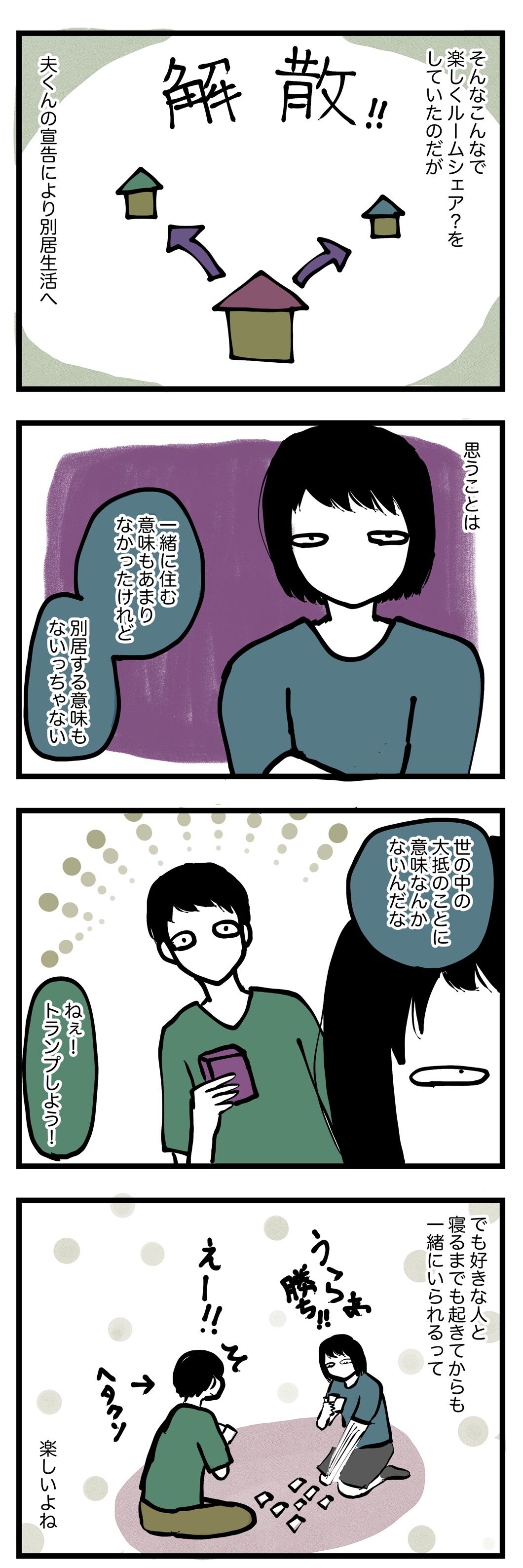 【家庭内ルームシェア】結局、同居と別居の違いとは? 2022年09月08日 歳の差16歳、社会不適合同士の子なし夫婦です。初めての方はこちらから歳の差の話はこちらから選択子なしの話はこちらから別居の話はこちらから私たち夫婦は現在別居中ですが、以前同居していたときも、結婚生活というよりルームシェアのような感じでした。家庭内ルームシェアシリーズ 前回のルームシェア話 別居と同居どちらが良いか?と聞かれることがありますが、正直、どちらも楽しいことに違いはあまりありません。私にとってはね。別居は別居で楽しいし、同居は同居で楽しい。どっちも好き。でも、離れたことによって、お互いの心の余裕ができて、適度な距離感ができたことを考えたら、それだけで十分別居した甲斐はあったかな。こちらもどうぞ にほんブログ村 ご連絡はmochizukiyt@gmail.comへ 「家庭内ルームシェア」カテゴリの最新記事 タグ :#ルームシェア#歳の差 < 前の記事次の記事 >