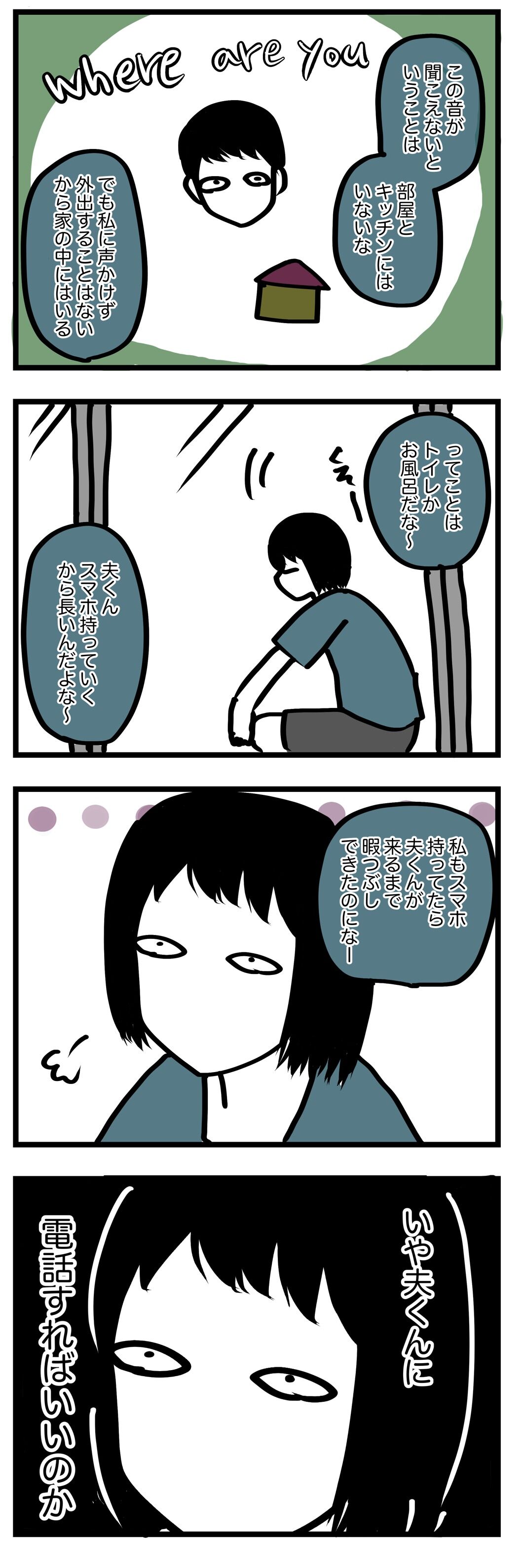 【ベランダ閉じ込め】バカの発想 2022年12月11日 平成生まれの望月ゆたと、昭和生まれの夫くん、2人で暮らしています。2人の日常を漫画にして、綴っていきます。 初めての方はこちらから歳の差の話はこちらから別居の話はこちらから前回の話 理解力ってどうやって身につくんだろうね。-------------------------------------------------------------本日の話 こちらの続きです。ベランダにいたら夫くんに鍵をかけられてしまった。これ以上騒いだら迷惑になるので大人しく待つことにして…バカの発想。スマホ大事だね。今回は別に死ぬほどの寒さでもないし長くても1時間後には救出される見込みがあるから(風呂かトイレと仮定して)全然良いんだけど、場合によってはスマホの有無で生死を分けるもんね。続きます。スマホって便利 「ベランダ締め出し事件」カテゴリの最新記事 < 前の記事次の記事 >