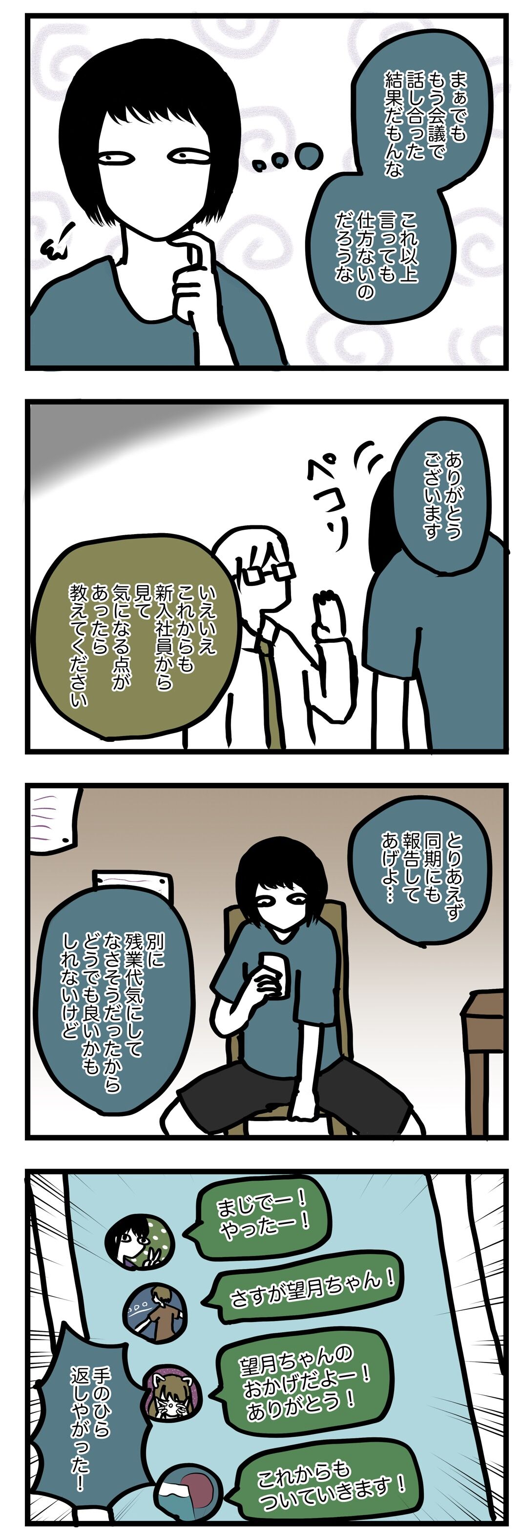 【新人研修】自分の手は汚さない 2023年01月04日 平成生まれの望月ゆたと、昭和生まれの夫くん、2人で暮らしています。2人の日常を漫画にして、綴っていきます。初めての方はこちらから歳の差の話はこちらから別居の話はこちらから昨日の記事 本日の記事こちらのシリーズの続きです。 前回の話はこちら よくわからないけれど戦い尽くした気がした私。もう余計なことは言わないことに。あんなに興味なさそうだったくせに!※こちら参照 でもおこぼれでラッキーにあやかれたらそれが一番楽だし賢いよね。わかる。人間らしくて素敵だと思います。お役に立てて何よりです。こちらもどうぞ ランキング参加中です。 更新通知などなど。 LINEスタンプ販売中です。 「新人研修」カテゴリの最新記事 < 前の記事次の記事 >
