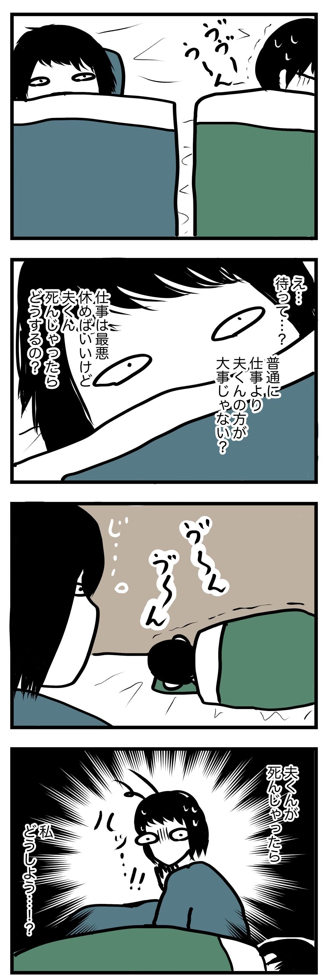 突然心を入れ替えた【救急搬送2】 2023年01月14日 平成生まれの望月ゆたと、昭和生まれの夫くん、2人で暮らしています。2人の日常を漫画にして、綴っていきます。初めての方はこちらから歳の差の話はこちらから別居の話はこちらから昨日の記事 本日の記事↑昨日の記事の続きです。さて、明日の仕事に備えてもう一度寝よう…。寝よう…。さっき見捨てたくせに。寝ぼけた頭が少し冴えてきてじわじわとことの重大さを感じ始める。愛する夫くんが苦しんでいるではないか。続く こちらもどうぞ ランキング参加中です。 更新通知などなど。 LINEスタンプ販売中です。 「救急搬送」カテゴリの最新記事 < 前の記事次の記事 >