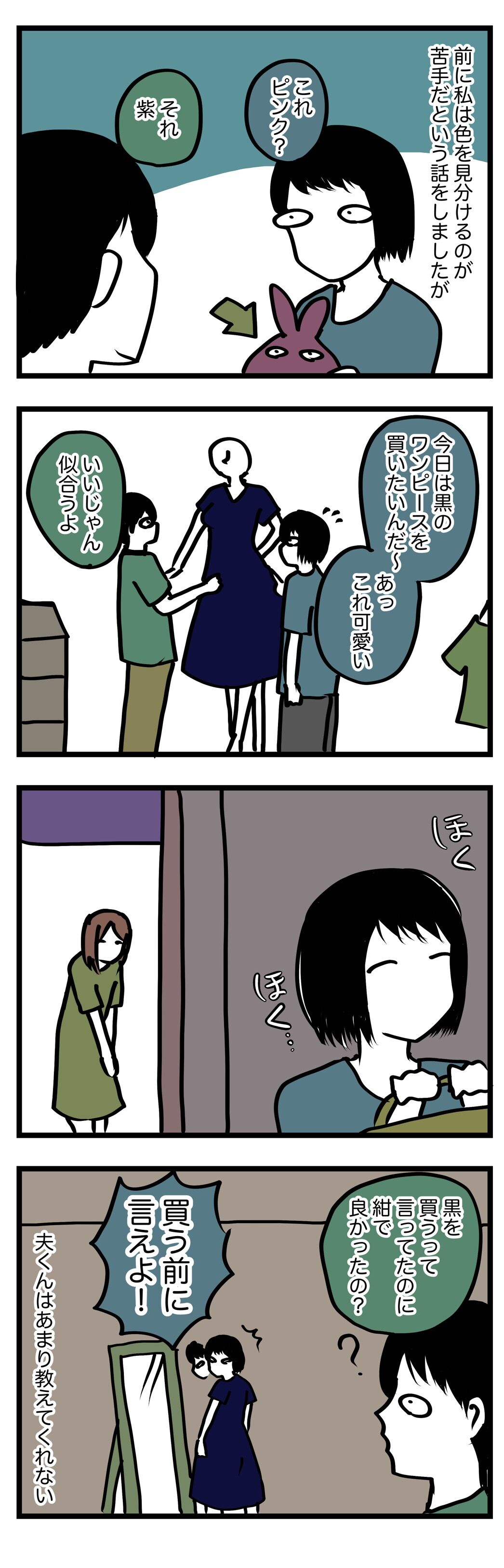 色を見分けられない故に 2023年02月15日 平成生まれの望月ゆたと、昭和生まれの夫くん、2人で暮らしています。2人の日常を漫画にして、綴っていきます。初めての方はこちらから歳の差の話はこちらから別居の話はこちらから昨日の記事本日の記事以前、私は色を見分けることが苦手という話を書きました。 いつも様々な人に助けてもらいながら問題なく生活しています。黒がほしかったのに!!いや夫くんは悪くない。悪いのは私の脳みそ。でも贅沢言うようだけれどできたらレジを通す前に教えてくれ。こちらもどうぞ ランキング参加中です。 更新通知などなど。 LINEスタンプ販売中です。 「夫婦の日常」カテゴリの最新記事 < 前の記事次の記事 >