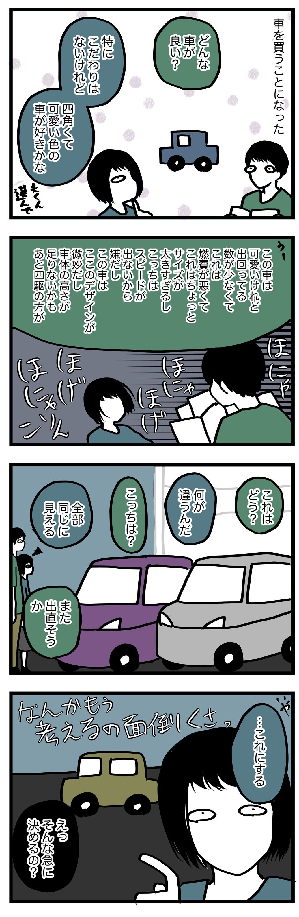 買って1ヶ月で車がぶっ壊れた話1 2023年02月17日 平成生まれの望月ゆたと、昭和生まれの夫くん、2人で暮らしています。2人の日常を漫画にして、綴っていきます。初めての方はこちらから歳の差の話はこちらから別居の話はこちらから昨日の記事 本日の記事結構前の話ですが、車を買いました。私にとっては人生初のマイカーということで夫くんは気合を入れて車を選んでくれました。もう車のこと考えるの飽きたよパトラッシュなんだかとてもどれでもいいんだ…半年近く車探しに奔放した結果望月得意の「目に入ったやつを買う」が勃発。これが事件の発端となるのでした。続く こちらもどうぞこの車です。 ここでは買わなかった これは車内の事件 ランキング参加中です。 更新通知などなど。 LINEスタンプ販売中です。 「車がぶっ壊れた」カテゴリの最新記事 タグ :#車 < 前の記事次の記事 >
