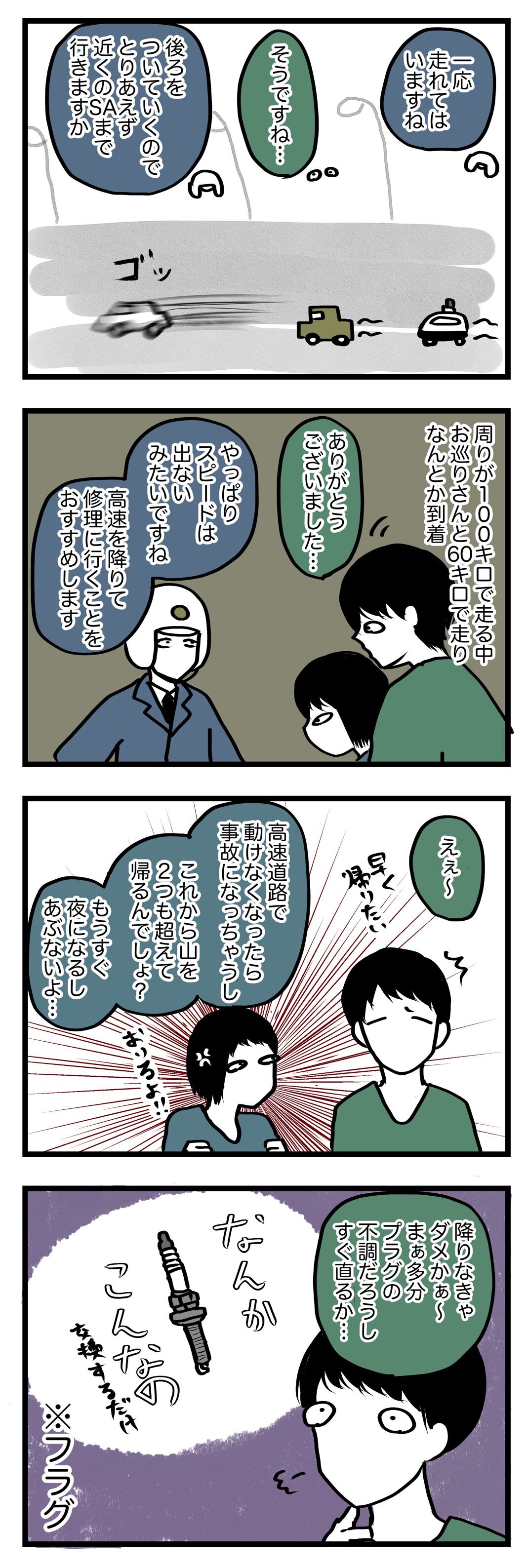 買って1ヶ月で車がぶっ壊れた話5 2023年02月23日 平成生まれの望月ゆたと、昭和生まれの夫くん、2人で暮らしています。2人の日常を漫画にして、綴っていきます。初めての方はこちらから歳の差の話はこちらから別居の話はこちらから※10時半頃に間違えて明日の記事を投稿してしまいました。通知行ってしまってすみません。また明日に投稿し直します〜。昨日の記事 本日の記事こちらのシリーズの続きです。 私は車に詳しくないので間違っていたらすみませんがプラグ(スパークプラグ)はガソリンを着火させるライターのようなものらしく、消耗品のパーツです。こんなの↓ リンク 夫くんの予想ではこれが不調の原因だから交換さえしてしまえば直るはず、とのこと。それならば安心。と思ったけれど、当然フラグです。続く。 こちらもどうぞ腐りました。 ランキング参加中です。 更新通知などなど。 LINEスタンプ販売中です。 「車がぶっ壊れた」カテゴリの最新記事 タグ :#車#故障 < 前の記事次の記事 >