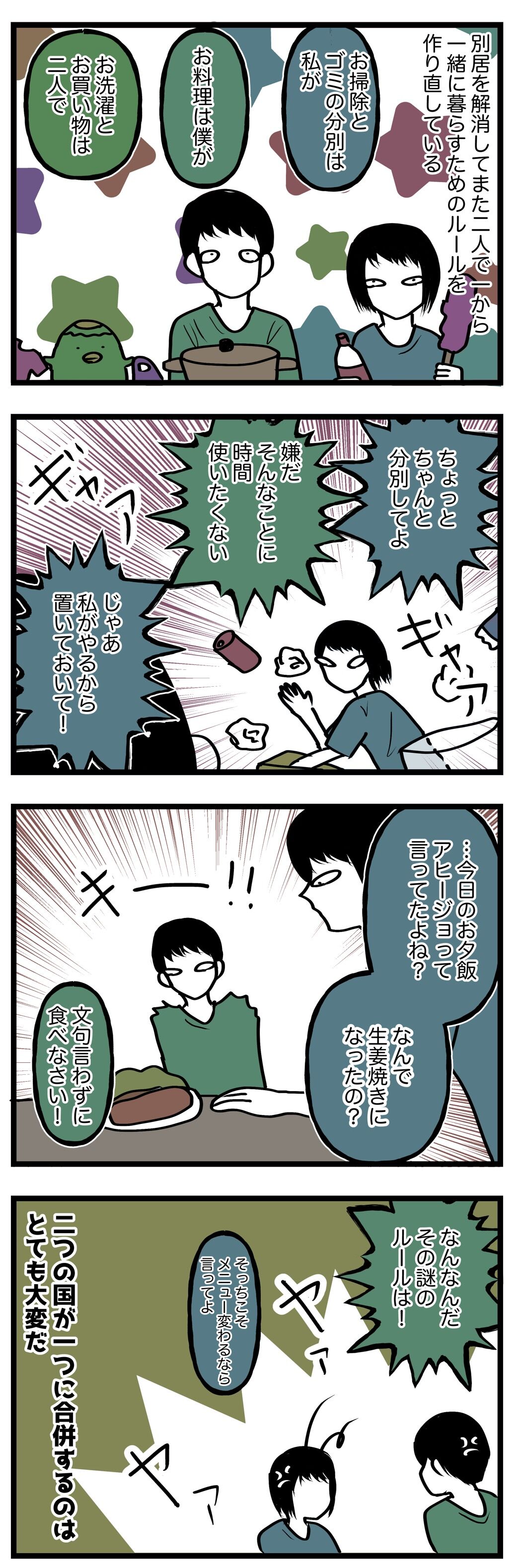 【別居解消】一から始めるって結構な労力 2023年03月29日 平成生まれの望月ゆたと、昭和生まれの夫くん、2人で暮らしています。2人の日常を漫画にして、綴っていきます。初めての方はこちらから歳の差の話はこちらから別居の話はこちらから昨日の記事 本日の記事私たち夫婦は別居していましたが別居解消しまた一緒に住むことになりました。別居シリーズ別居解消シリーズ政治って難しいんだなぁ〜。こちらもどうぞ ランキング参加中です。 更新通知などなど。 LINEスタンプ販売中です。 「別居解消」カテゴリの最新記事 タグ :#別居 < 前の記事次の記事 >