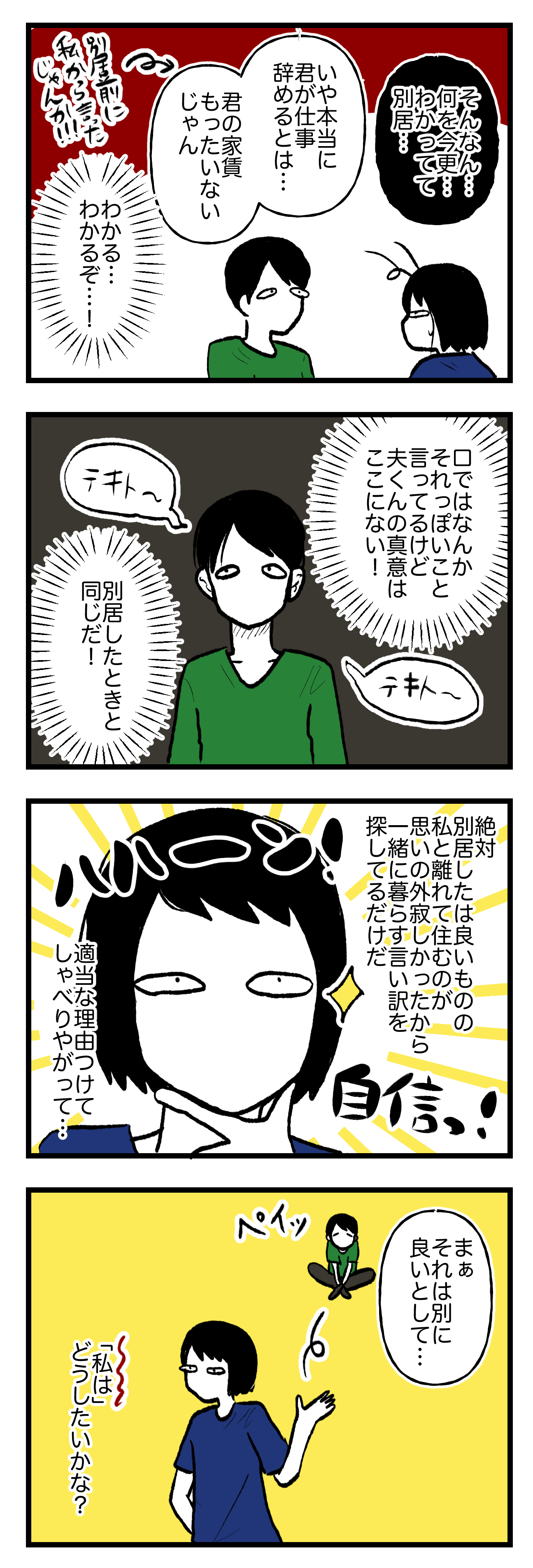 大好きな夫と別居してみた(69) 2024年02月15日 自己紹介昨日の記事 本日の記事少し間が空きましたが前回の続きです。 急展開。夫くんってそういうとこある。それはさておき大切なのは「私は」どうしたいか。「私が」どう思うか。「夫くんは」もう一度一緒に住みたいと思ってくれているみたいだけれど。私はどうだ?続きます。 こちらもどうぞ ★ランキング参加中です。ポチっと1回クリックで投票できます。何卒よしなに。★SNSやっています。★アプリで更新通知が届きます。★LINEスタンプ販売中★ 「大好きな夫と別居してみた。」カテゴリの最新記事 タグ :#別居 < 前の記事次の記事 >
