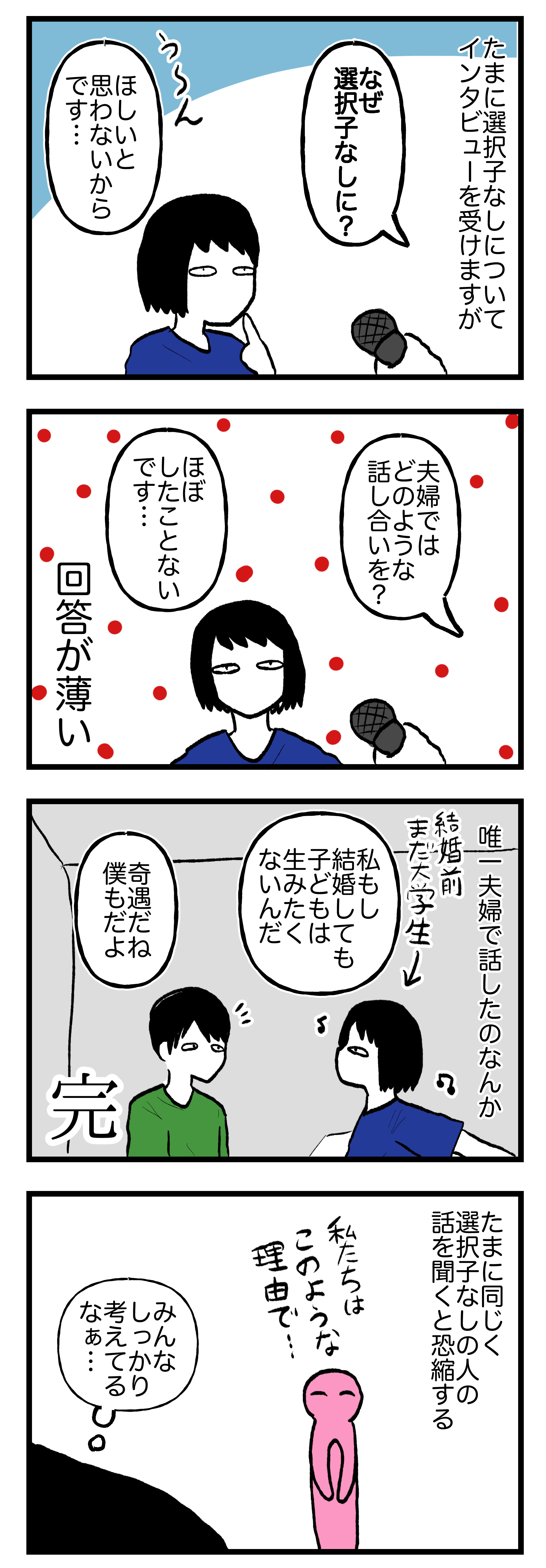 なぜ選択子なしになったのか 2024年06月10日 自己紹介本日の記事今まで大体の理由は描いてきましたがいざ聞かれるとコレ!っていう回答が難しい。あなたはなぜしまうまを飼わないんですか?とか聞かれた時に悩むのと同じ感じ。多分。 ★ランキング参加中です。ポチっと1回クリックで投票できます。何卒よしなに。★SNSやっています。★アプリで更新通知が届きます。★LINEスタンプ販売中★ 「子なし」カテゴリの最新記事 < 前の記事次の記事 >