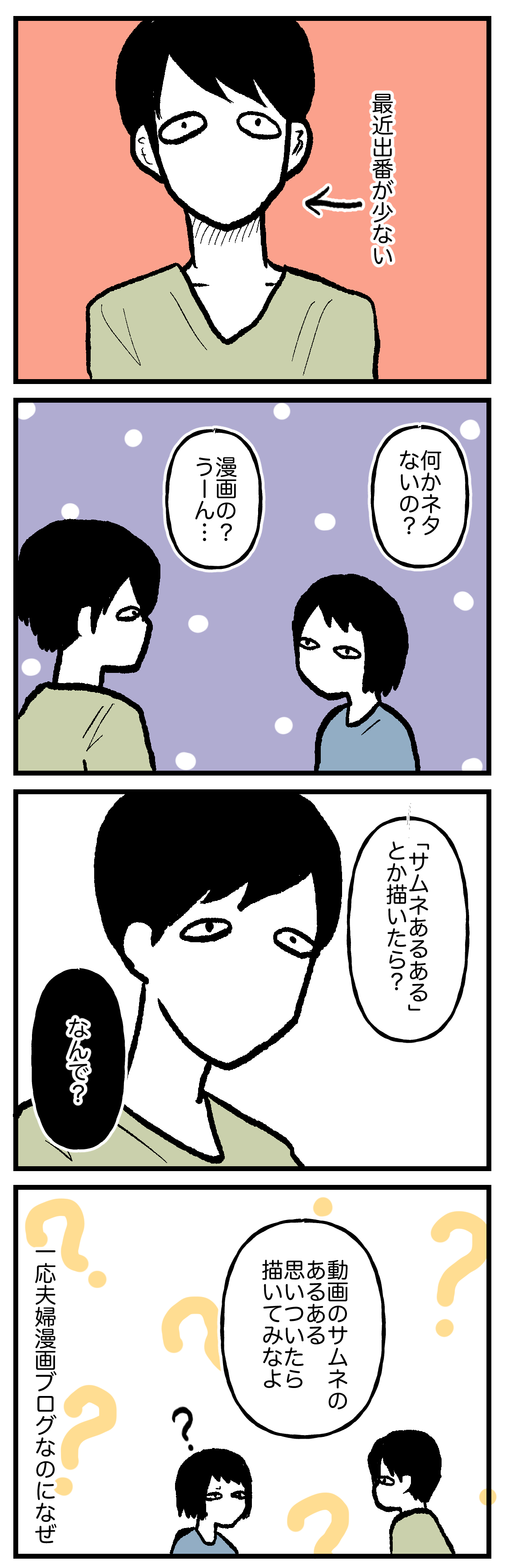 夫くん考案のネタ 2024年06月26日 自己紹介本日の記事あるある漫画に路線変更?(3コマ目前髪反転しちゃった。)夫くん、ネタがないだけで元気にしています。こちらもどうぞ ★ランキング参加中です。ポチっと1回クリックで投票できます。何卒よしなに。★SNSやっています。★アプリで更新通知が届きます。★LINEスタンプ販売中★ 「夫の日常」カテゴリの最新記事 < 前の記事次の記事 >