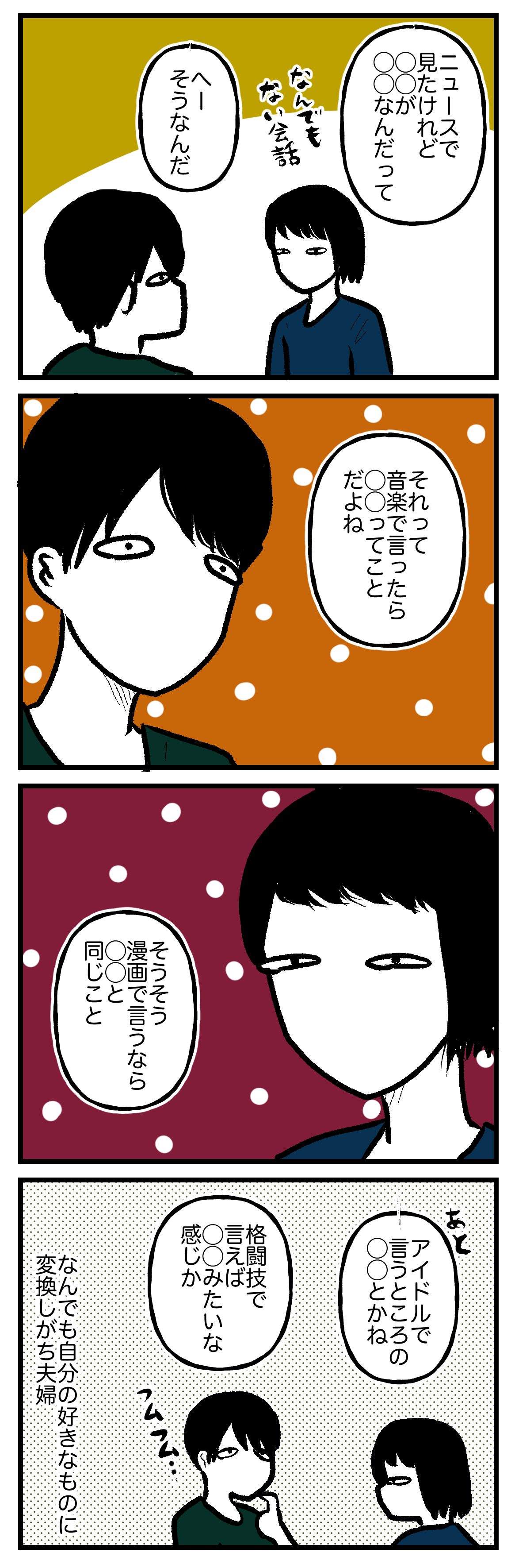 自分の土俵でしか戦えない 2024年10月09日 自己紹介昨日の記事 本日の記事なんの話してんだかよくわからん。薄々お気付きの方もいらっしゃるでしょうが私のブログが朝6時半より遅く更新されてるときは漫画のストックがなくて慌てて描いたときです。こちらもどうぞ ★ランキング参加中です。ポチっと1回クリックで投票できます。何卒よしなに。★SNSやっています。★アプリで更新通知が届きます。★LINEスタンプ販売中★ 「夫婦の日常」カテゴリの最新記事 < 前の記事次の記事 >